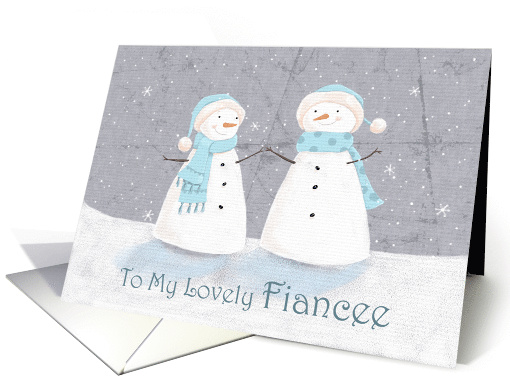 To My Lovely Fiancee Christmas Holiday card. Illustrated with a cute snowman couple in a pastel art style. Background in the style of textured parchment paper. ©DaleSimpson