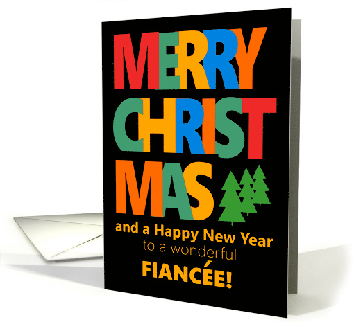 A colourful text-based Christmas card for your fiancee with oversized letters in bold red, orange, yellow blue and green, all on a black background. The black background will print best if 'Glossy' is chosen. The front cover greeting, is 'MERRY CHRISTMAS' in large capital letters, spread over three lines, with a little row of green Christmas tree shapes filling the leftover space in the third line. Below that is 'and a Happy New Year to a wonderful FIANCEE!' in matching orange. The inside message is just a suggestion which you can easily edit or remove altogether if you prefer a 'blank inside' card.
