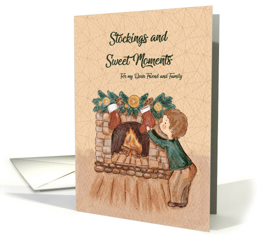 A watercolor-style Christmas card featuring a young child hanging red stockings on a stone fireplace. Above the fireplace, there's a festive garland made of pine leaves, pinecones, and dried orange slices. A cozy fire glows in the hearth. The text on the front reads “Stockings and Sweet Moments” For friend and family