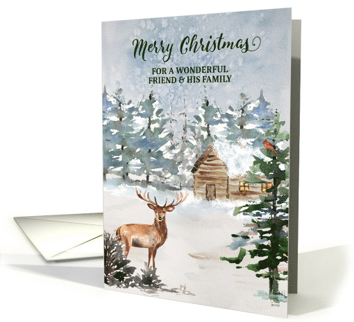 A merry Christmas card for your dear friend and his family with a charming forest scene with a rustic log cabin.