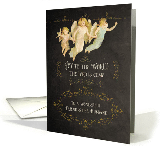 Wish your friend and her husband a merry Christmas with this stylish and trendy (chalkboard effect) card featuring vintage angels (courtesy Graphicfairy) on a grungy chalkboard with eroded text (Joy to the World) and swirls. You can edit text inside card (Luke 2:10). Custom requests welcome