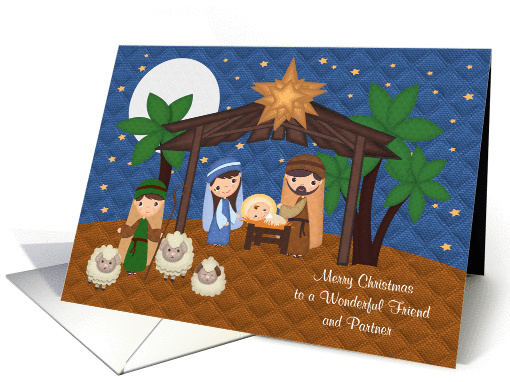 Christmas to Friend and Partner, Nativity Scene with Baby Jesus, stars