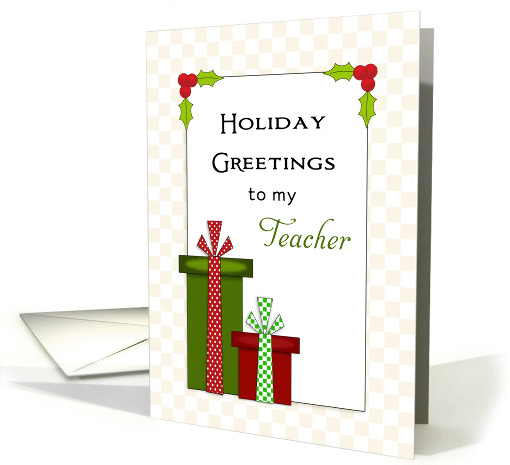 Christmas card for teacher with illustration of two Christmas presents. Inner verse is customizable. Thank you for visiting Sheryl Kasper Card Store