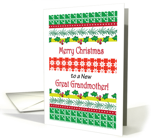 This is a Merry Christmas card for a new great grandmother, featuring my digital design of colorful patterns and holly. ©Gail Pepin. You can change the inside message at checkout, if you wish.