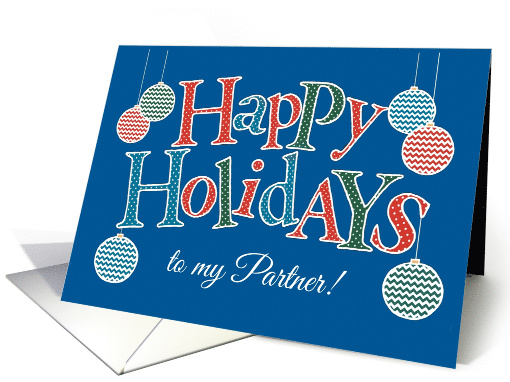 | Artist Notes: | A fun, text-based Happy Holidays card for a Partner, with Ornaments and Lettering, filled with red, blue and green chevrons and polka dots, outlined in white on a bright blue background. There is also a custom front card with this design in case you can't find a card for the specific recipient you're looking for. |