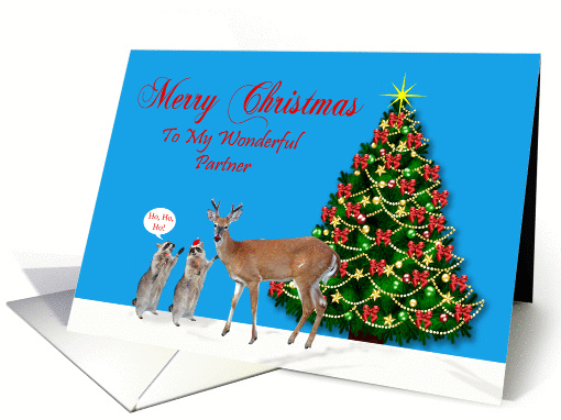 | Title: | Christmas To Partner, Raccoons with reindeer and decorated tree, blue |