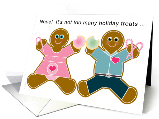 | Artist Notes: | A fun way to announce your pregnancy with this whimsical pair of gingerbread people. Let folks know that it's not too many holiday treats ... it's a baby bump! At least that excuse will work for one of half of your couple. Feel free to add to, or change, the inside text to make this card yours. |