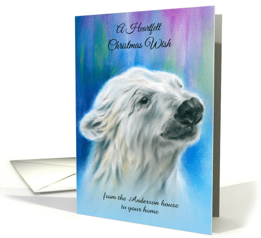 A heartfelt holiday wish accompanies this artwork in soft pastel hues picturing a lovely white polar bear set against the glorious blue, pink and green colors of the Northern Lights, or aurora borealis. Personalize the front with your family name or any other text.