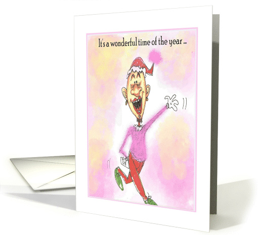 A gay man runs down the street signing. He is wearing a beautiful pink sweater waving his hands in the air. This wonderful colorful festive holiday card is just fabulous.