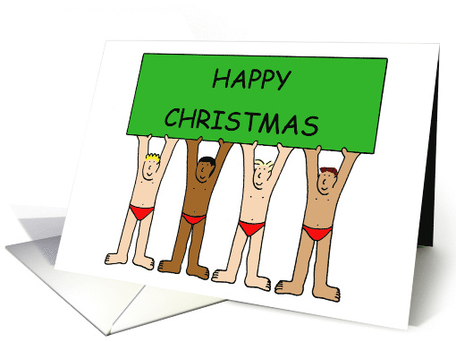 Four cartoon men wearing red underpants, holding up a large green banner that say 'Happy Christmas'.. A funny Christmas card for the festive season!