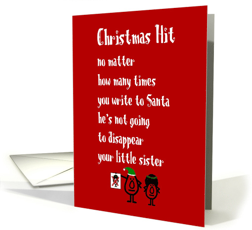 A funny Merry Christmas card, featuring a bad poem and illustration, about the limited power of sending letters to Santa. Kids will be kids and can sometimes lose patience with each other, even at Christmas time (but we assume these letters are not really serious about the "disappearing" thing).