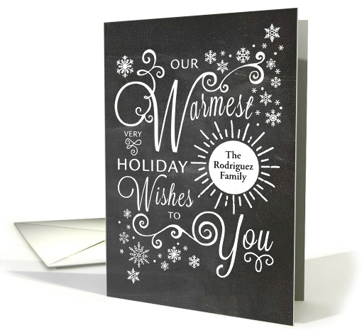 An ornate blackboard style Christmas card with snowflakes and curly embellishments sets a lovely seasonal tone for sending friends and family your very warmest holiday wishes. Add your name to the front of the card for a personal touch or customize for a loved one.