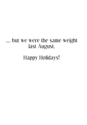 Santa Claus dons a white chef's hat and sets out a table full of eats and drink, and lays it on the line: fat doesn't just come and go with the holiday season, it sticks around all year long. Heavily laden with good humor, good cheer, fine spirit and juicy, succulent turkey, lobster, ham, fruit, mashed potatoes, hard liquor and white-foamed beer, this funny, colorful, clever card is a feast both for the senses and the sense of irony. So, dig in, to a heaping helping of joyous Xmas that you'll carry with you in your heart and your waistline for the other 364 days of the annum, as well.