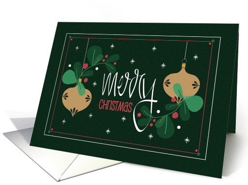 Send this uniquely beautiful holiday card to each of your family members and friends, as you celebrate the arrival of Christmas this year. Elegant red and white hand lettering scrolls across the center of the deep and richly colored green card, with the words "Merry Christmas". On either side of the wording, two golden-colored ornaments are suspended from the top border, with curving branches of Christmas berries overlapping them, peppered with round red berries. White twinkles add sparkle and joy to this delightful card. The cards inside wording says "Wishing you a holiday filled with love and happiness."