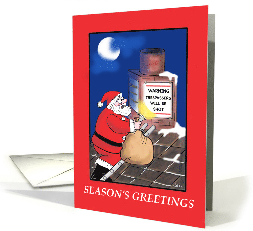 It's Christmas Eve and Santa has lots of deliveries to make but he is shocked when he climbs his ladder onto the roof and discovers a sign warning him that trespassers will be shot! How is he going to get the presents inside?