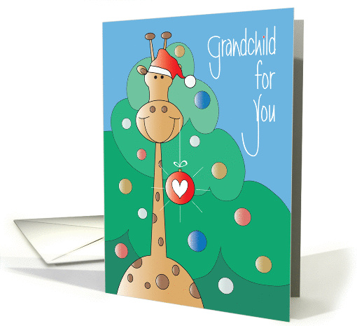 This darling Christmas card is perfect for each of your very special Grandchildren this holiday. They'll chuckle at the delightful long necked giraffe as he holds a lovely red, dazzling ornament with a single white heart in it, from the corner of his mouth, as a token of his celebration of Christmas. Behind him a decorated Christmas tree, covered with cheerfully colored ornaments, adds to the festive feel of the card and to the tree's right is the hand lettered wording of the card "Grandchild for You". The inside wording of the card is "Hope your Christmas is dazzling. Merry Christmas with love and hugs."