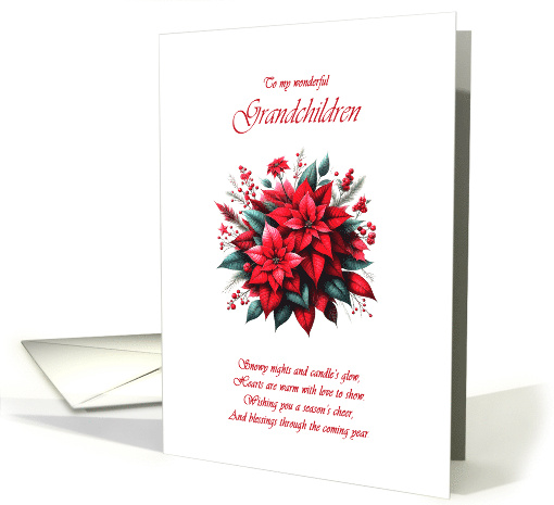 | Artist Notes: | A Christmas card for your grandchildren. A bouquet of lush poinsettias decorates the card, their petals vivid and inviting. Inside, a heartfelt verse wishes warmth and joy for the season, embracing the spirit of Christmas with beauty and love. A beautiful and elegant way to send Christmas greetings. |