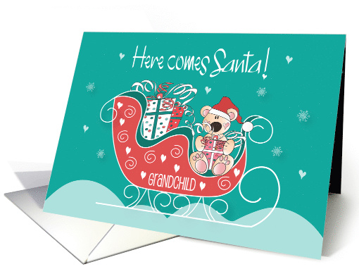 Delight each of your Grandchildren with this fun Christmas card and its little chubby Santa Bear, who is front and center in Santa's heart and swirl-decorated red, white and teal-colored sleigh. The sleigh, with gliding runners and handles that roll in curling swirls of white, is loaded down with all sorts of wrapped polka dot gifts, including one the little bear is holding in his front paws. Hearts decorate his cheeks, and a few float through the air, along with white snowflakes, all around Santa Bear. Topping the card, is hand lettered words that say "Here comes Santa!". The card's inside wording is "Merry Christmas with love and a big bear hug!"