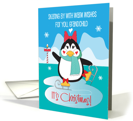 "It's Christmas!" is the red hand lettered wording, written across the icy-blue pond on this darling Christmas card for your little girl Grandchildren. The card's little penguin has a large red bow on top of her head, long fluttering eyelashes, red hearts from the cold on her cheeks and a warm neck, thanks to the green wool scarf around her neck. She is balancing on one leg and ice skate, as she drifts across the ice, in front of the distant snow-covered mountains. Hand lettered wording, in red, says "It's Christmas" and mixes with the white skating marks she has left on the ice. Over her bow-topped head more wording says "Skating by with warm wishes for you, Grandchild". The card's inside wording says "Merry Christmas, with lots of love, to a very sweet Grandchild!"