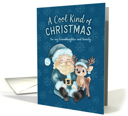 A watercolor-style Christmas card features a smiling Santa Claus and a sweet reindeer, both dressed in teal blue winter hats and coats. They sit close together against a textured dark teal background with soft snowflake motifs scattered throughout. Above them, the text reads “A Cool Kind of Christmas” in playful, handwritten-style lettering. The overall design has a charming, cozy, and slightly modern feel, perfect for a heartfelt holiday message. For granddaughter and family