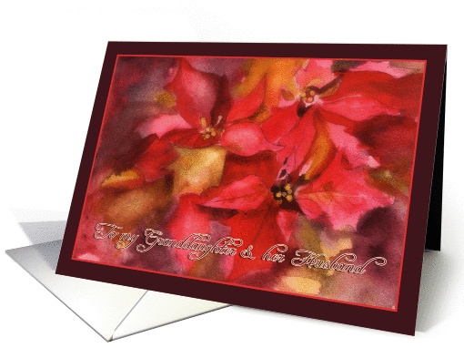 | Artist Notes: | This elegant Christmas card features a vibrant, original watercolor painting of red and green poinsettias framed by a black background. A stylish way to wish your granddaughter & her husband a merry Christmas. You can edit text inside card. |