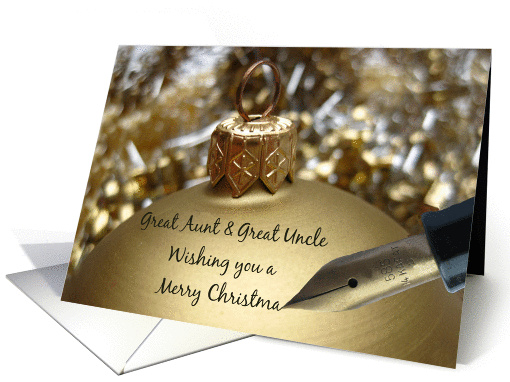 | Title: | Great Aunt & Great Uncle christmas greeting - fountain pen writing christmas message on golden ornament |