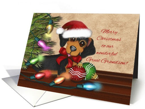 Merry Christmas to our wonderful Great Grandson. An adorable dachshund wearing a santa hat and a big red bow has pulled the glowing lights and ornaments off the tree. Inside message says: " We woof you very much! " Inside message may be changed by you