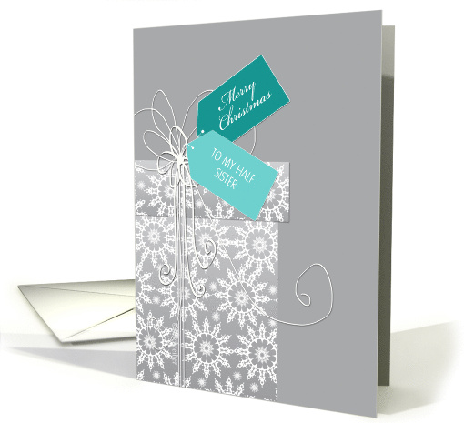 Send warm Christmas wishes to your half sister with this contemporary Christmas card. This elegant card features a present or gift (wrapped in grey gift wrap paper with white snowflakes) white swirly ribbon and tags. You can edit text inside card yourself