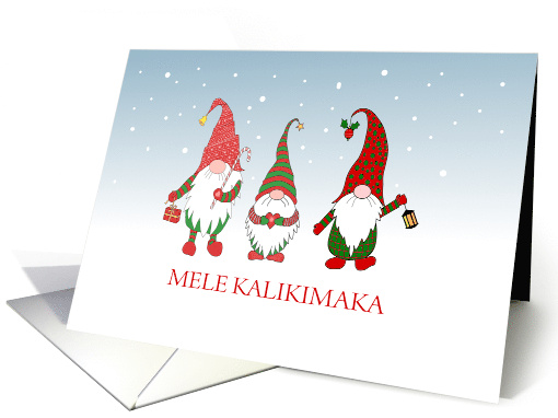 A fun Christmas Card with the greeting in Hawaiian, and a cartoon gnome, with a tall, pointed hat and a long white beard. The gnome is carrying a glowing lantern and his hat is decorated with holly and a Christmas ornament. legend tells us that these gnomes live in remote farmhouses and make sure the farmer looks after his livestock and keeps his farm clean. At Christmas they appreciate a bowl of porridge with a knob of butter on top. There is a snowy background and below the gnomes is the greeting, 'MELE KALIKMAKA' in red lettering. The inside is left blank for your own message.