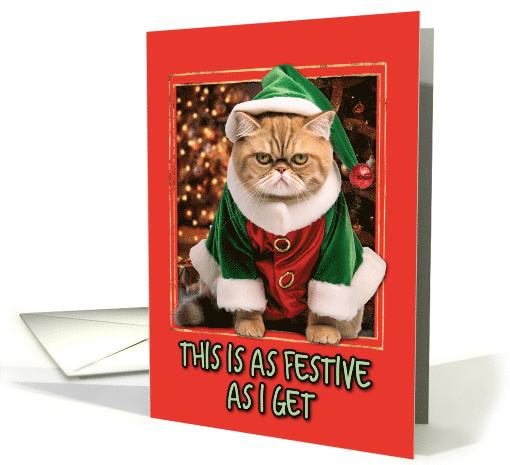 Santa's little helper is not feeling very jolly on a red background with the text 'This is as festive as I get'. A hilarious grinch-type card to send to your friends and loved ones for the holidays.