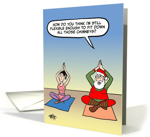 A Christmas greeting card with cartoon artwork featuring Santa doing yoga class next to another yoga student and telling her, "How do you think I'm still flexible enough to fit down all those chimneys?"