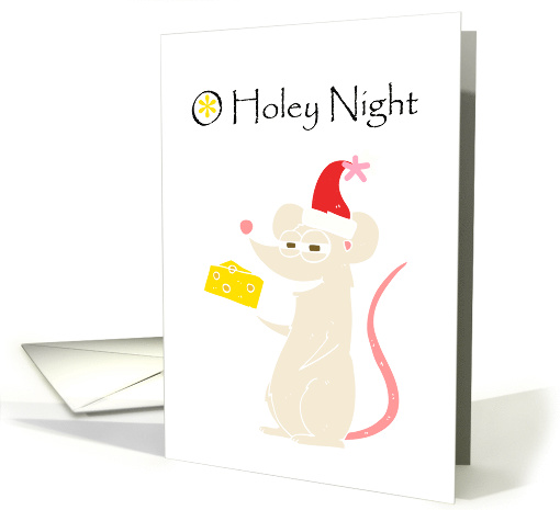 O Holey Night, Merry Swissmas, funny Christmas paper greeting card with an illustration of a mouse wearing a Santa Claus hat and holding a piece of creamy yellow Swiss cheese. A yellow star is inside the letter O at the top of the page.