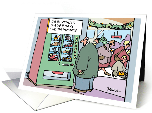 A man does his Christmas shopping at a vending machine as everyone else rushes through the mall shopping. Inside reads, You push all the right buttons. Have a simply wonderful Christmas! Great card for anyone with a sense of humor and who yearns for a simpler solution to the shopping frenzy we cal Christmas! Thanks for checking out my greeting cards.