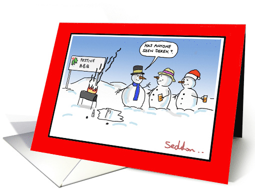 A humorous blue and red comic cartoon card with a Christmas themed cartoon of snowmen at a festive barbecue, The caption is "Has anyone seen Derek?" as a cartoon speech bubble from one of the snowmen. A puddle by the hot barbecue indicates Derek`s fate.