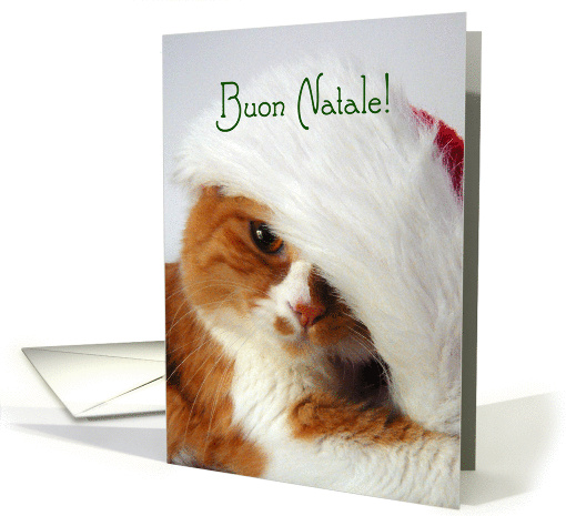 | Artist Notes: | This Christmas card features an orange and white cat wearing a Santa hat that's draped over one eye, with the Italian greeting "Buon Natale" (Merry Christmas) on the cover. The inside is blank for your own personal message. Photo by designer. |