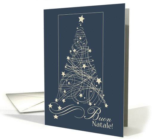 | Artist Notes: | An elegant and festive Italian Christmas card with a deep blue background and a Christmas Tree shape made of swirls and stars in light beige. Text at the right corner of the card reads "Buon Natale" |