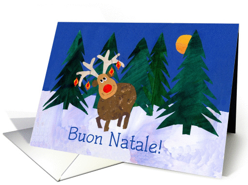 | Artist Notes: | A Christmas Card with 'Merry Christmas' in Italian and a red-nosed reindeer with ornaments hanging from its antlers, from a handpainted paper collage by Judy Adamson. Please contact me through my store if you would like the front text changed and the inside is left blank for your own message. |