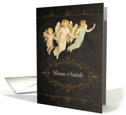| Artist Notes: | Translation: "Merry Christmas" in Italian. This stylish and trendy (chalkboard effect) Christmas card features vintage angels (courtesy Graphicfairy) on a vintage inspired grungy chalkboard with eroded text and swirls. You can edit text inside card. Custom requests welcome. |