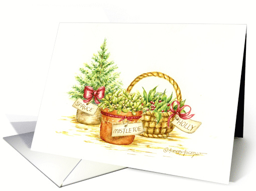 Artist Notes: Winter greens of a miniature spruce tree, holly basket and a clay pot of mistletoe, bring together the spirit of the season. A special holiday greeting with a gift enclosed for someone special! Inside Verse:Wishing you bright days for the season and enjoy the gift enclosed. Merry Christmas! Original watercolor artwork and design by Audrey Ascenzo.❤️