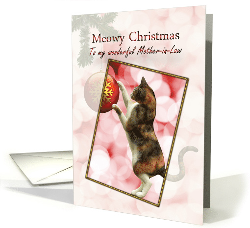 | Artist Notes: | A funny Christmas card for your mother-in-law showing a calico cat standing on hind legs and playing with a red ball decoration on a Christmas tree. A fun card to send to cat loving friends or family. |