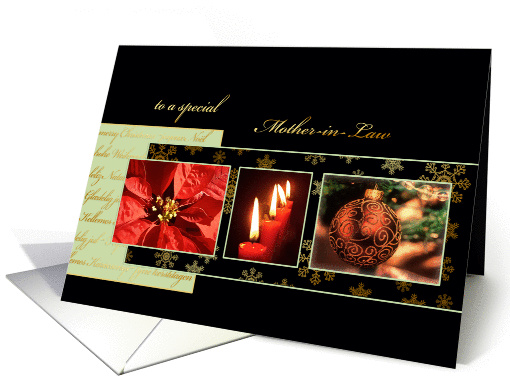 | Artist Notes: | You can insert your own text inside (text, font, color, size). Custom requests welcome. This stylish and elegant Christmas card features a poinsettia, an ornament & red candles on a black/green background. Text front of card: gold effect. |