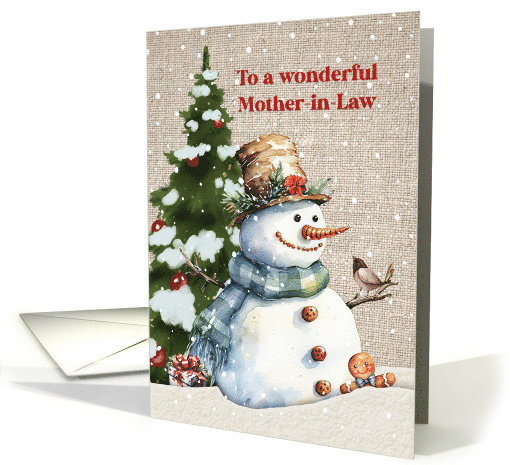 | Artist Notes: | Give your mother-in-law a whimsical Christmas greeting featuring a snowman in the snow with a gingerbread man, a Christmas present, and a bird. This design also includes a Christmas tree and falling snow. |