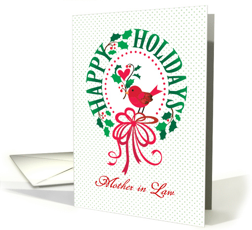 | Artist Notes: | Happy Holidays typography wreath on a green dot background. A little red bird holds a branch of holly with a heart for your Mother in law. İMindy Pierce |