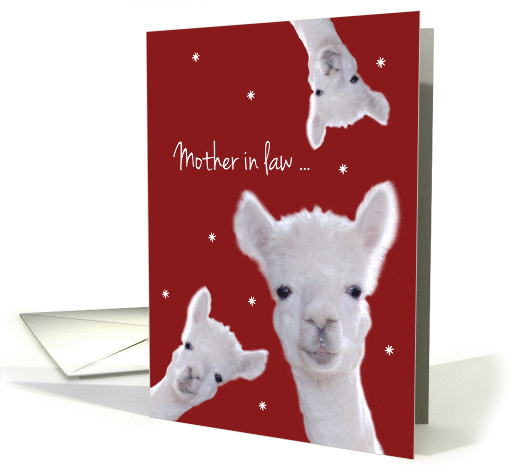 | Artist Notes: | Wish your Mother in law a warm and fuzzy Christmas with this humorous holiday card that features three fuzzy, white llamas peeking in from all different angles and directions with tiny white snowflakes on a bold red background with a playful, fun typeface. |