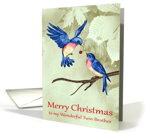 | Artist Notes: | Wish your wonderful twin brother a Merry Christmas with a card featuring a beautiful blue bird with a red ornament in his beak flying close to another blue bird sitting on a branch on a leafy background with dark text. Birds by Digital Designs by Elena |