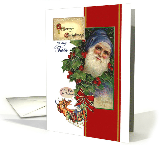 | Title: | Christmas for my Twin, Vintage Santa wears Blue, Reindeer Red Ribbon |