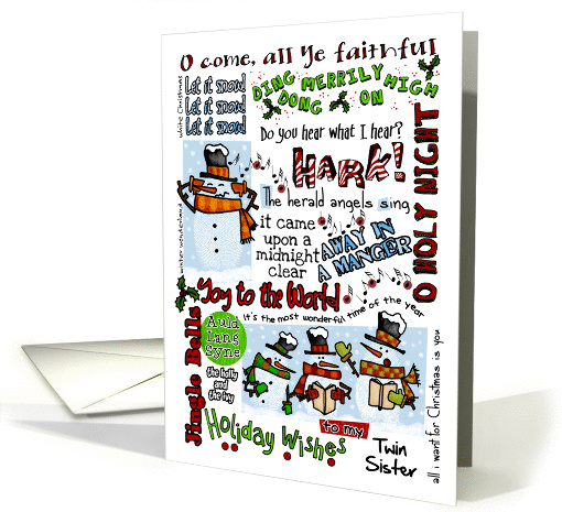 | Artist Notes: | Caroling fingerprint doodle snowmen in a winter landscape are surrounded by a subway art inspired word cloud arrangement of christmas song titles and carols with holly and musical notes accents. A very festive way to send your best holiday wishes to your twin sister! |