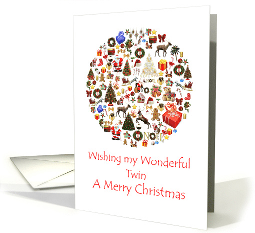 | Artist Notes: | Wish your twin a Merry Christmas. A circle full of Christmas goodies, including Santa, lots of presents, Christmas trees, and reindeer. A joyful Christmas card for someone special. |