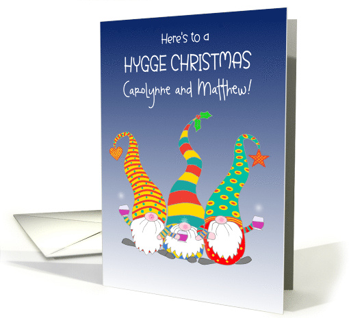Three jolly gnomes are wishing your friend or relation a warm and cosy Christmas from our home to yours. The gnomes, or 'tomtar', have rosy red noses, peeking out from under their very tall, colourfully patterned hats and they all have huge, white beards, in the Scandinavian tradition. The front cover greeting, in white lettering on dark blue, is, 'Here's to a HYGGE CHRISTMAS (space for you to add the name or relation' The inside message is just a suggestion and you can easily change it or delete it altogether, if you prefer a 'Blank Inside' card.