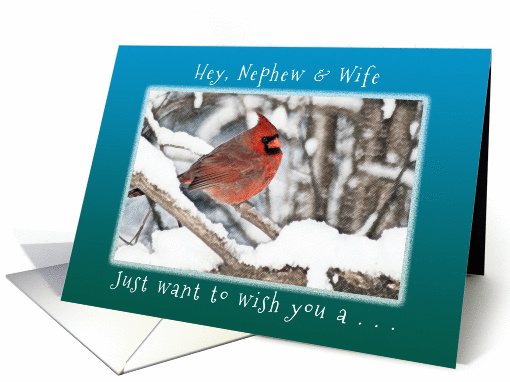 A beautiful winter scene with a cardinal sitting on a snowy winter morning. A simple colorful card your nephew and his wife will enjoy.